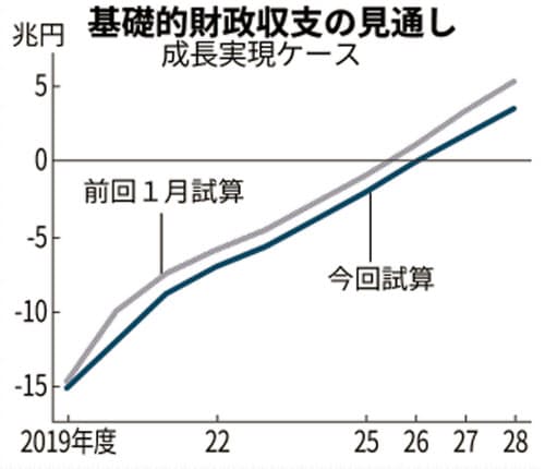 1月時点の試算では、PB黒字化が以前の見通しから1年早まり26年度になるとみていた。再び27年度に遅れるのは、19年度の名目成長率見込みが1.7%と、従来の2.4%から下振れしたためだ。将来の名目国内総生産(GDP)も減り、それに見合う形で税収が伸び悩む。