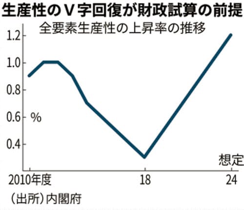 ただ、厳しいように見える今回の試算も、前提は極めて甘い。イノベーションの進展などを反映する「全要素生産性」の伸びは現在、年0.3%程度だが、これが24年度に1.2%まで高まると想定している。5年間で0.9ポイントもの上昇はバブル崩壊前の1980年代半ばのペースだ。