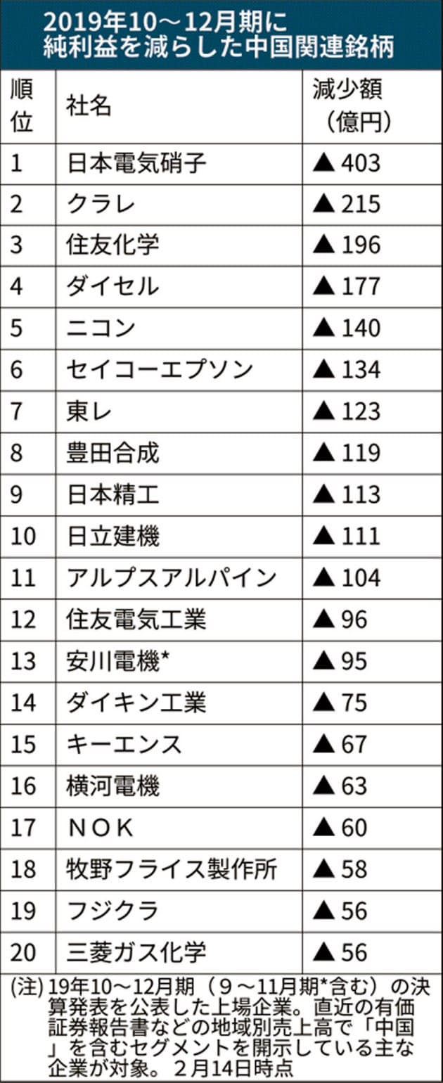 中国経済の減速が日本企業の業績に影を落としている。中国の売上高比率が1割以上の企業を対象に2019年10~12月期の純利益を調べたところ、素材や電子部品関連の企業の落ち込みが大きかった。米中貿易摩擦を背景に中国で自動車やスマートフォンの生産が縮小。中国への部品などの輸出が減少した。