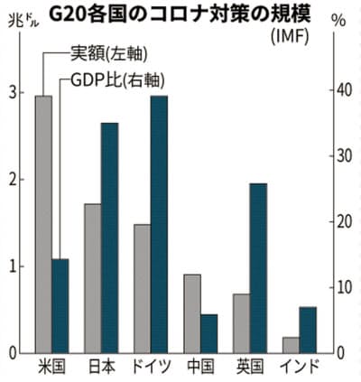コロナ対策の財政出動などの規模は、G20を中心に世界で約12兆ドル(約1250兆円)に達する。米国が3兆ドル、日本が1.7兆ドル、ドイツが1.5兆ドルと主に先進国が大胆な財政支出で景気の底割れを防いできた。