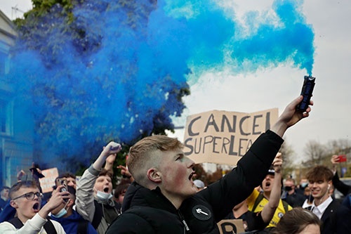 英国のサッカーファンは、欧州スーパーリーグ構想に抗議している(写真:AP/アフロ)