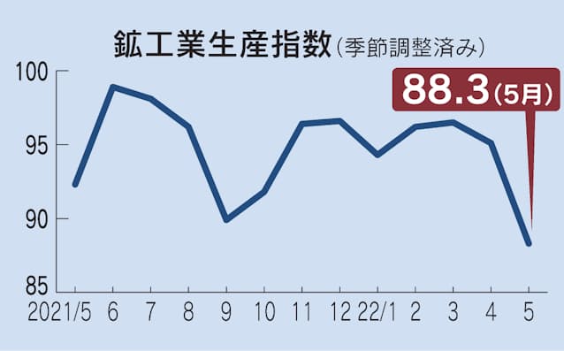 経済産業省が30日に発表した5月の鉱工業生産指数(2015年=100、季節調整済み)速報値は88.3となり、前月比7.2%下がった。マイナスは2カ月連続。新型コロナウイルスの感染拡大を受けた中国の上海市などの都市封鎖で生産や物流が停滞した影響が続いた。自動車工業、電気・情報通信機械工業などが低下し、経産省は生産の基調判断を「足踏みをしている」から「弱含み」に引き下げた。