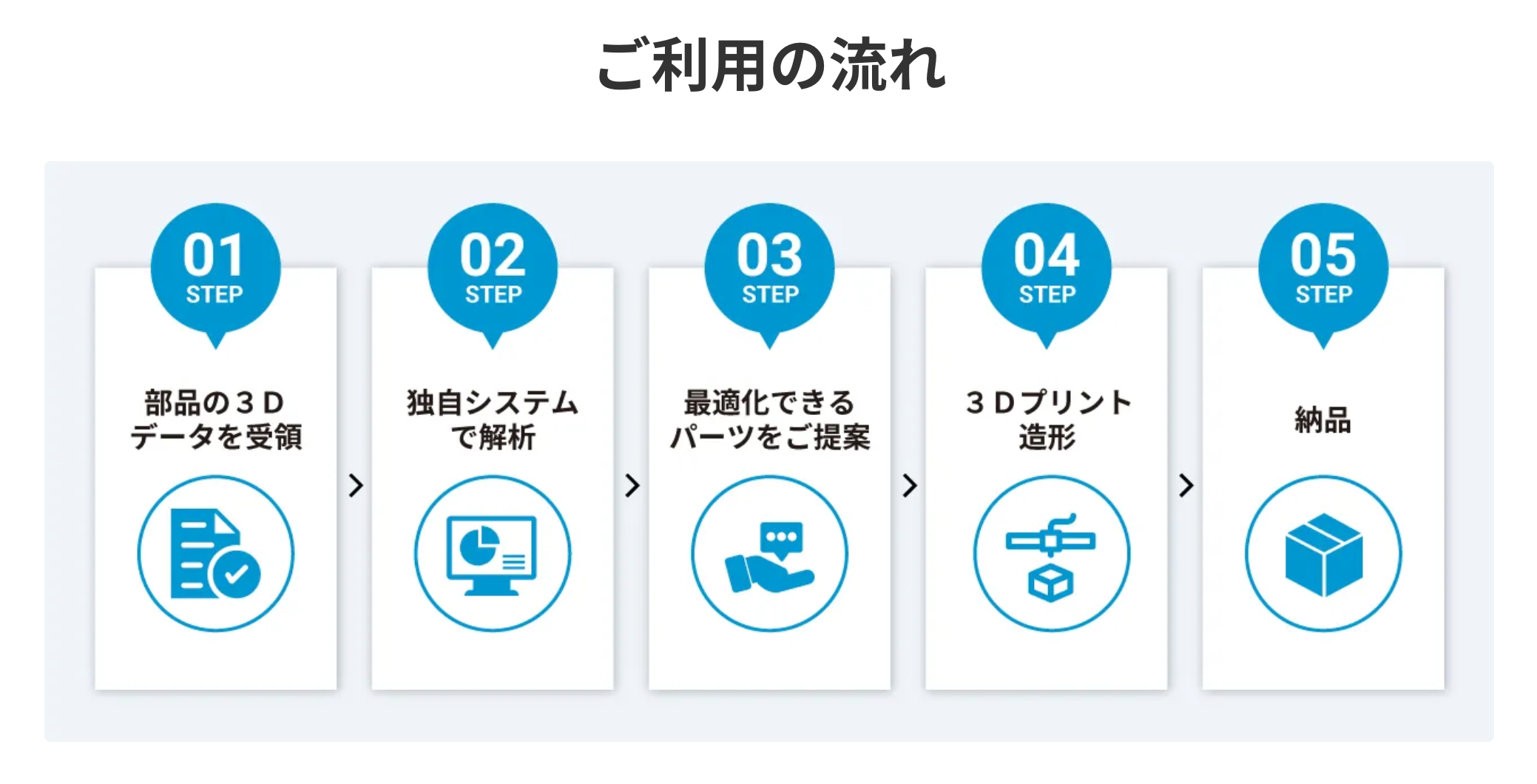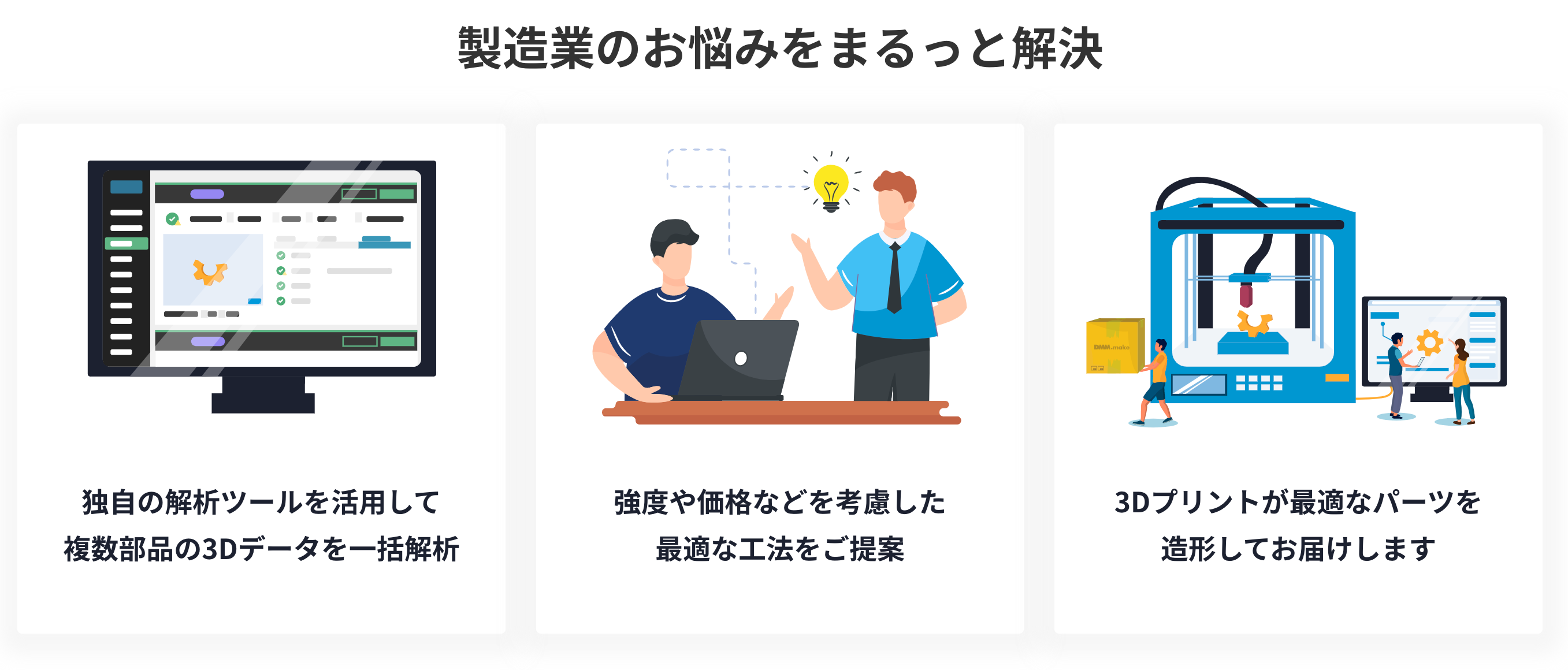 ユーザーは3Dデータを提出するだけで、3Dプリントで最適化できる部品を把握でき、その後の造形までお任せすることができます。